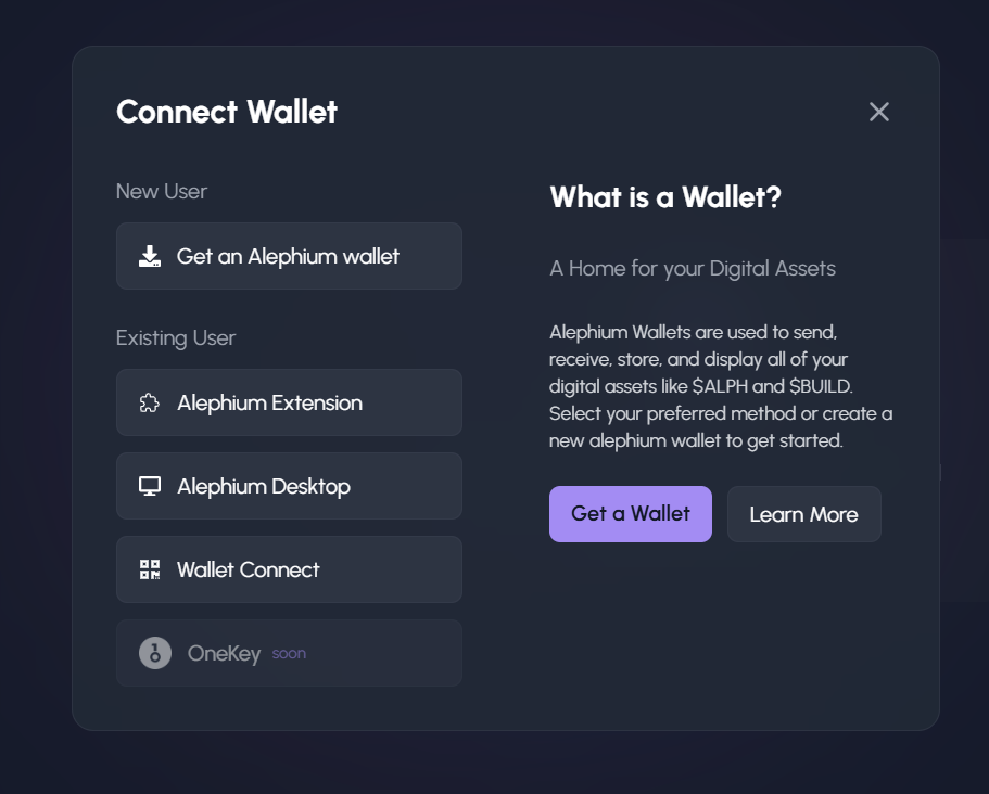 Next, connect your wallet using one of the available methods. Please ensure you have an address belonging to **GROUP 0** to participate in staking. (<https://docs.alephium.org/fr/wallet/>)