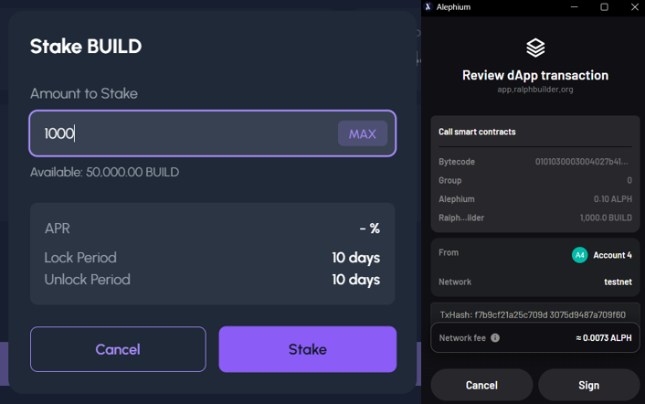 You can deposit an amount of $BUILD to stake and sign the transaction: